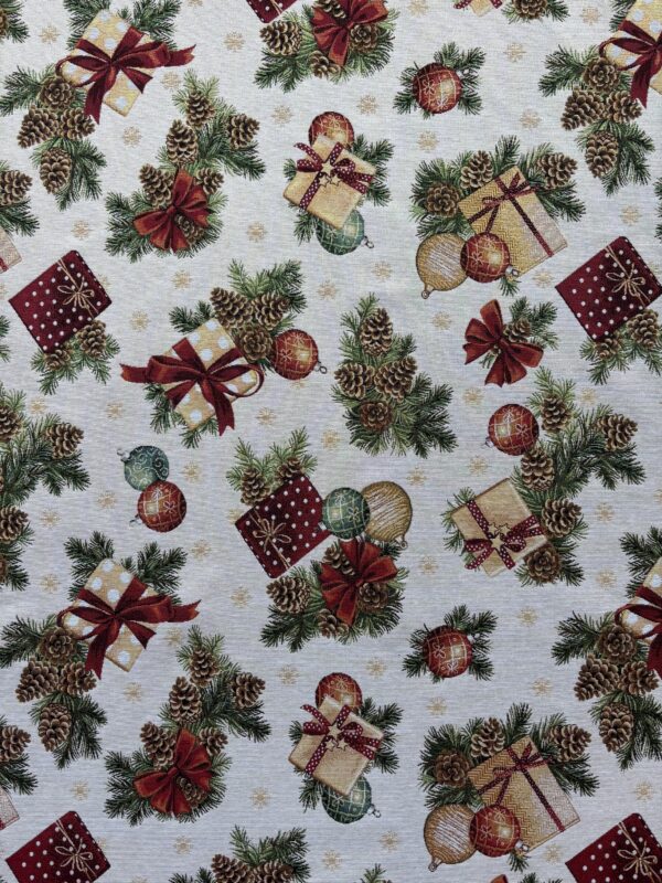In deze kerst gobelin stof zit een lurex draad, waardoor de stof een glitter heeft. Leuk te gebruiken voor tafelkleden, tafellopers, kussens en andere kerst decoratie.